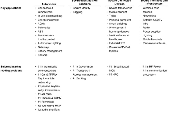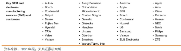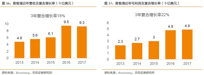 作为系统解决方案的领先供应商,英飞凌拥有丰富的产品组合,可用于辅助系统和智能驾驶。英飞凌的AURIX ™ 系列的微控制器确保了系统的可靠性。在执行器层面,AURIX ™ 负责本地实时计算并发送命令。对于部分和全自动驾驶而言,最重要的要求之一就是系统即使在出现故障时也能可靠地工作。为了实现这一目标,英飞凌为这些应用提供ISO 26262认证的组件,通过与互联网连接,可以为汽车提供越来越多的功能和服务。NXP恩智浦半导体(NXP)是一家注册在荷兰的上市公司,公司注册地点在荷兰埃因霍温。恩智浦公司早年为飞利浦公司的半导体部门,受半导体周期性拖累影响,营收利润波动较大,飞利浦公司转型医疗健康后,将半导体部门整体出售给KKR集团,并于2010年8月5号在纳斯达克挂牌上市,首次公开发行3400万普通股。2015年3月,恩智浦宣布公司和飞思卡尔公司合并,合并与15年12月完成,恩智浦视为会计收购方,飞思卡尔每一流通股转换成0.3521股恩智浦股票及6.25美元现金。2015年,NXP以110多亿美元价格收购飞思卡尔公司后,其超越英飞凌、瑞萨等公司,成为全球汽车电子半导体第一大企业,合并公司在汽车电子领域,微控制器和安全半导体解决方案方面一举成为市场的领导者。恩智浦公司提供全球领先的高性能混合信号(HPMS)和标准产品(SP)解决方案,公司在加密安全、高速接口及射频领域有着显著的专利优势。产品解决方案主要应用于汽车电子、个人安全识别、移动通信、工业、消费电子等行业。根据2017年年报显示,恩智浦2017年全年营业收入为92.6亿美元,受标准产品业务剥离的影响,同比下降3%(2016年营收为94.98亿美元),恩智浦在汽车(15%CAGR)和安全(12%CAGR)市场的强势定位为恩智浦公司提供了长期的可持续增长,从而抵消了通信基础设施方面的近期担忧以及智能手机市场增长的乏力。