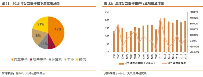 4.1.1. 汽车用功率半导体——汽车电能转换和控制的核心部件分立器件是重要的电子元器件,广泛应用在计算机、通信、消费电子、汽车电子、工控等领域。目前全球分立器件的市场规模在200亿美元左右,其中汽车领域占比约为42%,是最大的应用市场。分立器件按照产品类型来分,包括半导体二极管、三极管、MOS、整流器、以及保护和滤波器件等。功率半导体器件是电能转换和控制的核心部件,设计成本小,通用性强,应用领域广,发展空间大。随着汽车电子、电信通讯等市场的飞速发展,分立器件仍有广泛的应用前景和发展潜力。新的器件理论、新的器件结构将推动各种新型分立器件的发展。国际大型半导体公司仍在市场上处于优势稳定地位,业务稳定。同时中国半导体产业保持着持续、快速、稳定的发展。