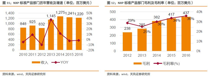 完整的业务布局、高品质的产品和客户资源为公司业绩提供了保障。统计NXP标准产品业务板块(安世半导体前身)的盈利情况,可以看到业绩表现亮眼,2010-2016年营收年均复合增长率达到6.25%,毛利率水平自2013年以来稳步提升,盈利能力持续增强,2016年营收达到12.2亿美元,毛利率高达35.8%。公司通过自有代工体系实现满产,能够实现高毛利率水平,同时快速反应销售与生产周期。