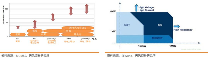 2) 新能源汽车带来的功率半导体质的变化不同新能源汽车电力系统的主要作用不同,中微混汽车的电力系统主要在空挡滑行时提供电动助力,而全混或者纯电动汽车的电力系统主要功能则是提供电力驱动。一方面,由于电力系统的主要功能不同,不同新能源汽车电力系统的运行电压功率的范围差异巨大。中混汽车的电压一般在150V以下,而全混合纯电动汽车的电压超过400V甚至更高。另一方面,不同功率半导体的工作电压不同,IGBT适合高压工作,而MOSFET适合低压工作。在电力驱动系统中,IGBT用于逆变器模块,该模块将蓄电池的直流电转换交流电驱动电机。在电源系统中,IGBT用于各种交流/直流与直流/直流变换器中,实现为蓄电池充电与完成所需电压等级的电源变换等功能。同时,新能源汽车充电桩中也需要大量使用IGBT。因此,新能源汽车导致了汽车功率半导体种中IGBT/MOSFET的使用量越来越大,种类也越来越多。