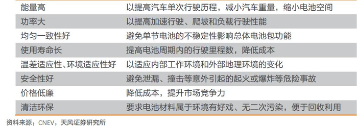 2.3. 新能源汽车的限制性技术-电池电池作为电动汽车的动力源,一直以来被视为电动汽车发展的重要标志性技术,也是制约电动汽车发展的重要瓶颈,其性能好坏直接影响到驱动电动机的性能,进而影响整车的行驶性能和排放性能。考虑到新能源汽车电池工作环境的复杂多变性,并需保持稳定持久的电能来源,电池性能要满足以下要求。