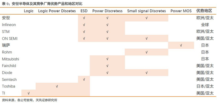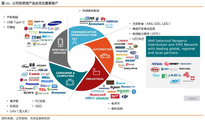 对比英飞凌、NXP、意法半导体、安森美、瑞萨等几家海外大厂的产品线,安世半导体产品线专攻于功率器件、ESD保护、小信号器件,在欧洲和亚太区优势明显。在NXP时期,安世产品与其他芯片产品一起通过欧洲主流车厂验证,形成稳定销售,在股权转让后,我们认为客户关系稳定。在大中华地区,公司开拓了主流的消费电子和汽车客户,预计此次收购后市占率份额将继续提升。