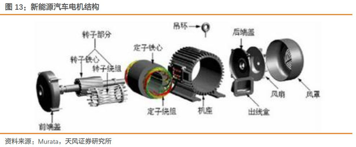 2.1. 汽车核心驱动部件-电机新能源汽车电机主要是由定子、转子和机械结构三大部分组成。定子和转子是其中的核心,主要原理是转子绕组通过切割定子旋转磁场产生感应电动势及电流,并形成电磁转矩而使电动机旋转。