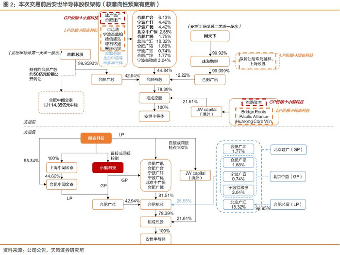 与前次预案相比,新引入格力电器、港荣集团、智泽兆纬等投资人,公司股权结构进一步优化。具体来看:1)格力电器合计出资30亿元,其中8.85亿元用于增资合肥中闻金泰,21.15亿元出资至珠海融林;2)珠海融林拟引入投资者珠海迪威出资2.023亿元,并受让珠海融悦持有的合肥广讯90.12%(意向性预案中为74.32%)的LP财产份额;3)港荣集团拟出资10亿元增资至合肥中闻金泰;4)智泽兆纬拟出资0.8亿元增资合肥中闻金泰。