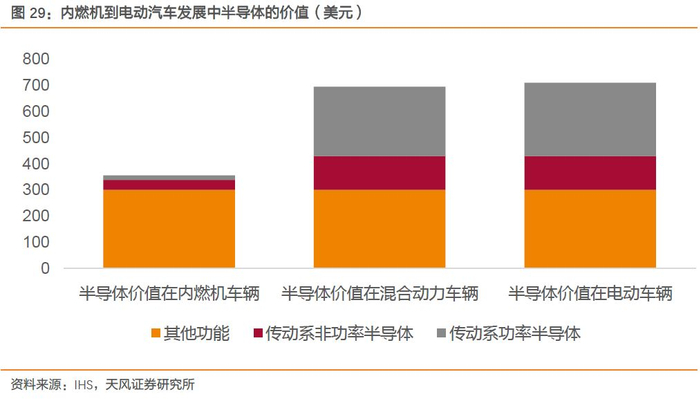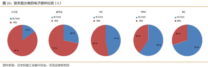 4.1.2. 新能源汽车带来的功率半导体应用变化新能源汽车带来的功率半导体量的变化汽车电子可分为动力控制系统、车载车身电子以及安全控制系统。车载电子包括车载信息系统、导航系统、上网设备和汽车音响等;车身电子包括汽车座椅系统、安全气囊、车窗升降系统、雨刮器系统、车灯照明、汽车空调系统以及防盗系统;安全控制系统可分为主动安全系统和被动安全系统。新能源汽车和传统汽车电子方面主要区别在于动力控制系统。传统的燃油汽车动力控制系统包括电子点火系统、电子燃油喷射系统等;而新能源电动汽车则包括动力电池系统、驱动电机和电控系统。新能源电动汽车出现了重大变化,简而言之,汽车将不再需要汽油发动机,油箱或变速器。决定电动汽车性能的关键部件是电动机,PCU(即逆变器,DC / DC转换器)以及其他核心电气部件。车内电气部件的平均比例将会大幅上升。