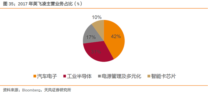 英飞凌营收分业务占比分别是,汽车电子42%,电源管理及多元化市场31%,工业半导体份额为17%,智能卡芯片占比为10%,平均毛利率为37.1%,对比2016年上涨1.1个百分比。