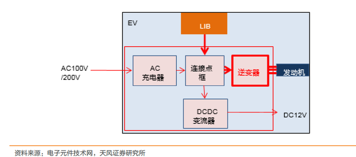 电动汽车配备有大容量可充电电池,其利用储存的能量来驱动电动机并为汽车供电。可充电电池不能直接连接到电机,它们通常通过电机逆变器连接,简称为逆变器。逆变器通常将DC12V的直流电转换为和市电相同的AC220V交流电。