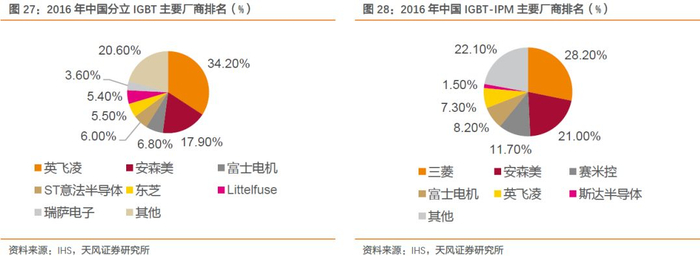 在日本的汽车制造商中,丰田汽车的所有这些零部件的内部生产比例都很高。本田汽车的传动系统相关的部件内部生产比例很高,从外部采购电池和转换器相关部件。日产汽车内部优先生产电机和逆变器,从日本国内供应商处采购其他部件。三菱汽车和马自达汽车的核心部件主要从外部采购获得。在欧洲的汽车制造商中,大众汽车的外部零件采购比例较高,主要供应商为采埃孚(ZF)和博世(Bosch)。TDK在为欧洲汽车制造商提供转换器方面有着悠久的历史,日本松下也有为其提供锂离子电池的市场份额。日立AMS向美国和欧洲的汽车制造商提供电机和逆变器。作为混合动力汽车、插电式混合动力汽车和电动汽车的核心,驱动电机由丰田汽车,本田汽车和日产汽车等日本主要汽车制造商内部生产,而马自达和富士重工从丰田汽车生产汽车。这些电子制造商也有供应日本国外汽车制造商的记录:日立AMS供应通用汽车,东芝供应福特汽车,日本电产供应戴姆勒。日立和三菱电机作为一家重型电机制造商拥有悠久的电机生产历史,并且在这一领域拥有出色的技术,但当前电机发展市场扩张速度较为谨慎。逆变器和变频器有助于控制整个车辆的电压。它们被称为功率控制单元(PCU)。丰田汽车为其核心车型生产自己的PCU,对于普锐斯而言,要么是公司自己生产IGBT、基板、机箱、DC-DC转换器,要么就由丰田代工。本田汽车为其混合动力汽车,插入式混合动力汽车和电动汽车的智能功率单元(IPU)组装PCU,镍氢电池,锂离子电池组和电池平衡ECU。本田飞度的IPU包含外部采购的零件,如三菱电机的逆变器和TDK的DC-DC转换器。本田汽车与三菱电机有很紧密的业务关系。逆变器是PCU和IPU中最重要的部分,由IGBT和其他功率器件组成。丰田、普锐斯使用由富士电机制造的逆变器。本田Insight系列采用三菱电机的逆变器,三菱iMiEV系列采用日立生产的逆变器。在DC-DC转换器中,丰田工业和电装供应丰田汽车。电装和松下为日产汽车供应DC-DC转换器。TDK,Shindengen Electric,丰田工业和电装供应本田汽车。在电子产品制造商中,尼吉康为马自达和三菱汽车提供DC-DC转换器。除了供应本田汽车和其他日本汽车制造商之外,TDK似乎也有供应通用汽车、福特汽车和大众汽车的记录。混合动力汽车,插电式混合动力汽车和电动汽车用电池是由汽车制造商和电池制造商之间形成的多家合资企业采购的,旨在磨练其发展的竞争优势。中国功率半导体市场在中高端MOSFET及IGBT主流器件市场上,主要份额依赖进口,基本被国外欧美、日本企业垄断,国内企业替代空间非常广阔。我们观察到海外的优质半导体企业被国内资本收购并上市的方式是国内潜在发展功率半导体的一个快速途径,我们看好闻泰科技收购的安世半导体依托中国市场进行国产替代成长的逻辑。