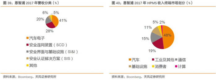 HPMS主要由以下四条业务线组成:汽车、安全识别、安全连接及安全接口基础设施。每辆汽车的含硅量的增长带动了公司产品的需求量的大幅提升,主要包括高级驱动程序辅助系统(ADAS)。车载网络和电动动力系统,信息娱乐等,随着汽车电子的不断深入发展,汽车安全功能正从被动安全系统发展到带有ADAS的主动安全系统,如雷达、视觉、车对基础设施(V2X)系统等,发达市场和消费者需求能有效推动ADAS,安全连接,电子安全设备等应用的增长。2017年恩智浦HPMS客户数量超过25000家,第一大客户份额仅为10%。体现出广泛的市场影响度。