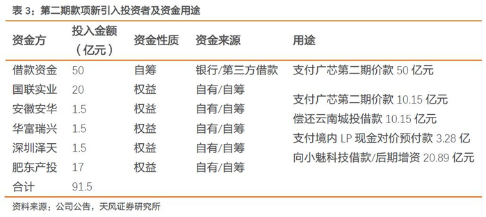 为满足本次交易的资金需求,合肥中闻金泰将引入国联实业等5 名投资者现金增资中闻金泰,用于支付第二期款项以及前期部分款项。