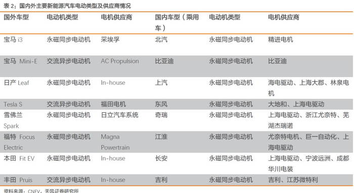 永磁同步电机:不同于直流电机是通过绕组内通电流产生磁场,永磁同步电机采用永磁体产生磁场,即定子产生旋转磁场,转子用永磁材料制成。其存在诸多优势:首先,因转子属于永磁材料,不仅避免了电阻损耗及产生的热量损失,而且结构上大大简化,既做到了高效节能又使得可靠性大为增强,寿命增加。另外,永磁电机气隙磁密度可大大提高,使得电机体积缩小、重量可相对减轻30%左右。永磁驱动电机起动转矩大,在汽车启动时能提供有效地启动转矩,满足汽车的运行需求。最后,力能指标好,当电机只有20%负荷时,其力能指标仍为满负荷的80%以上。且永磁无刷同步电机的恒转矩区比较长,一直延伸到电机最高转速的50%左右,这对提高汽车的低速动力性能有很大帮助。不过,永磁同步电机也存在一定缺陷,如电机整体造价较高、永磁材料性能受外部环境影响变化、控制系统成本偏高等。