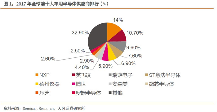 全球汽车半导体厂商主要有英飞凌、NXP、瑞萨电子、ST意法半导体、TI等龙头企业,根据Semicast Research的研究显示,2017年NXP全球市场份额达14%,领先第二名英飞凌3个百分点,前十名总份额达到67.1%,显示集中度进一步增加。