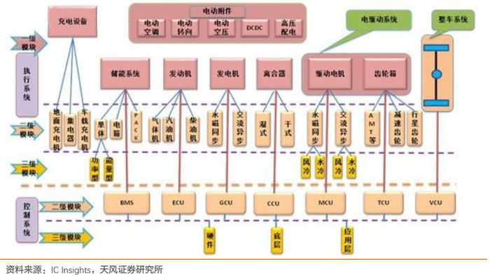 2.2. 汽车电控系统介绍新能源汽车控制系统部分则包括电池管理系统(BMS)、发动机电子控制单元(ECU)、发电机控制器(GCU)、离合器控制单元(CCU)、电机控制器(MCU)、变速器控制系统(TCU)和整车控制器(VCU)。其中核心是BMS\VCU和MCU。