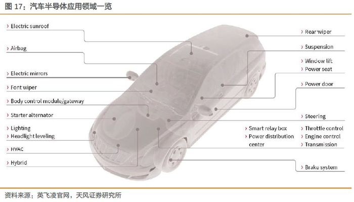 我们深度看好新能源汽车电子装置中半导体成分的增长,包括电机结合的电子控制装置和独立于动力系统以外的车载电子装备。电子控制装置主要是汽车动力、驾驶控制等系统组成,后者通常与通信、娱乐设备相关,汽车电子根据功能可分为车身控制系统(ECU)、安全系统、娱乐设备、底盘控制、高级驾驶辅助系统(ADAS)等,每个系统需要通过半导体器件实现相关功能,包括存储器、传感器、光电器件、射频器件、功率器件等。