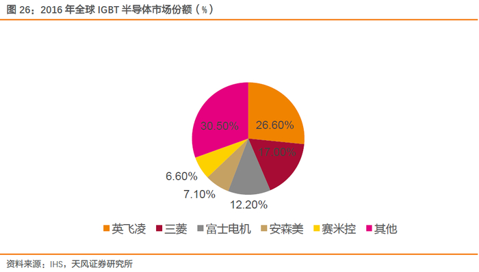 4.1.5. 功率半导体市场基本被海外垄断,国内企业替代空间广阔虽然功率半导体产业极具重要性,且规模庞大,但是主要供应商集中在美国、日本和欧洲。美国是电力电子器件的发源地,在全球电力电子器件市场中占有重要地位,主要器件企业有ON Semi等。从上世纪90年代开始,日本成为国际上电力电子器件产业的发达地区,主要器件企业有东芝、富士和三菱等。欧洲也是全球电力电子器件产业的发达地区,主要企业有英飞凌、ABB、Semikron等。美国汽车制造商通常从日本汽车零部件供应商处采购。通用汽车由日立AMS和TDK供应零部件,而福特汽车则从东芝采购传动相关零部件。就混合动力汽车而言,日本汽车制造商水平要高于美国,美国企业的策略是短期从日本供应商采购部件,同时在内部开发自己的部件,以逐步进行生产替代,这对国内汽车企业零部件国产替代化起到了良好示范作用。