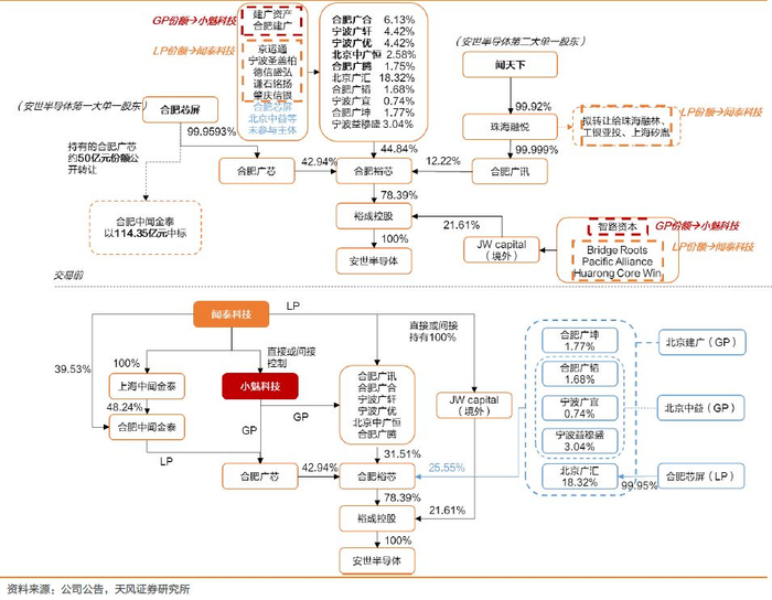 合肥芯屏和闻泰的母公司闻天下通过上述并购分别成为了安世半导体第一和第二大单一股东。据产业新闻显示,芯屏和闻天下当时各自出资约69.91亿元和13亿元,两家公司分别通过合肥广芯和合肥广讯间接持股。而此次安世半导体部分投资份额的转让方正是合肥芯屏,将其持有合肥广芯基金份额中约7成(50亿元)以114.35亿元出售给合肥中闻金泰联合体。