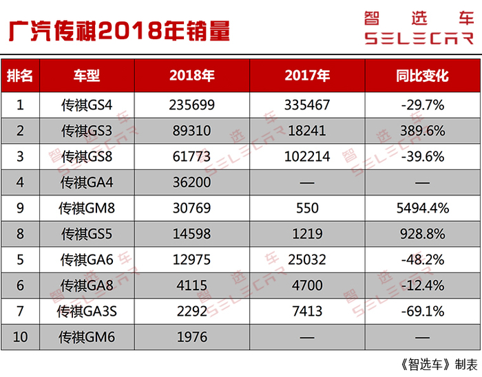 造成广汽传祺没有完成既定目标最大的原因还是来自两大主力车型的疲软导致。传祺GS4同比下滑29.7%,传祺GS8同比下滑39.6%,而其它车型虽然有所增长,但贡献可以说微不足道。