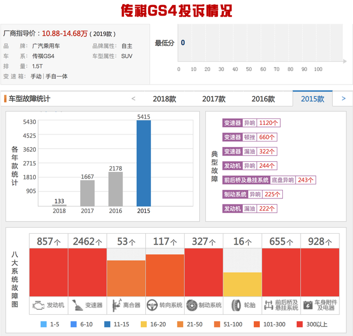 传祺GS4的双离合变速箱故障投诉频发,成为其销量下滑最主要的导火索。从质量投诉网站上可以看到,传祺GS4出现了大规模的变速箱顿挫、发动机漏油等现象,其中2015年投诉量达到了惊人的5415个,2016年虽有所减少,但也有2178个。如此重大的质量缺陷,厂家并没有进行大规模召回,只是在2017款车型上更换了新的变速箱,2015款和2016款车型的质量问题并没有解决。这样的做法无疑是对老车主巨大的伤害,新车主自然也望而却步。