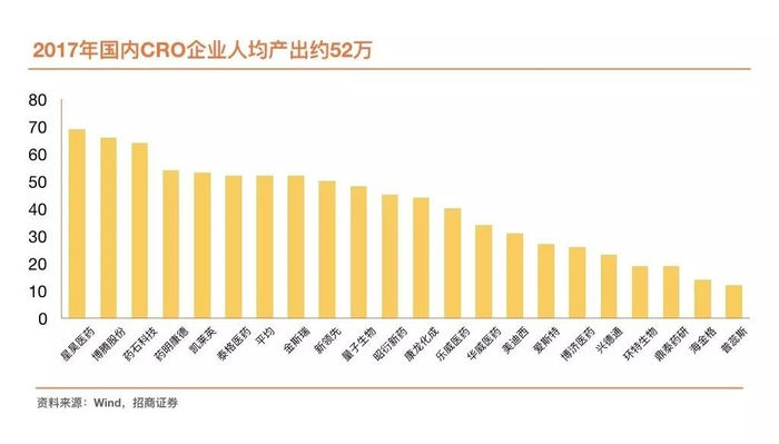 另一方面,招商证券统计了2017年25家已上市CRO企业财务数据后发现,我国CRO企业当年人均产出值约52万元,而同期海外领先CRO企业的人均产出均值约94万元,较国内高80%。这意味着,我国CRO企业在管理效率及盈利能力相对较差,主要原因包括临床研究的患者招募成本高、临床数据管理效率低以及缺乏根据前期数据调整后续试验方案的适应性设计等。