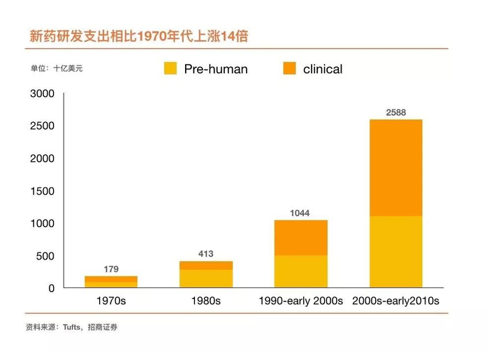 但新药研发素以高成本、长周期、高风险著称。根据塔夫茨药物研发中心数据,20世纪70年代时药物平均研发费用约为179亿美元,而21世纪前10年的平均研发费用较之上涨了14倍,已达2558亿美元,其中临床开发支出占比约60%;一个新药从药物研发阶段到FDA 批准上市平均需要10-15 年的周期,同时,新药Ⅲ期临床实验和新药申报的平均成功率已经降至60%以下。