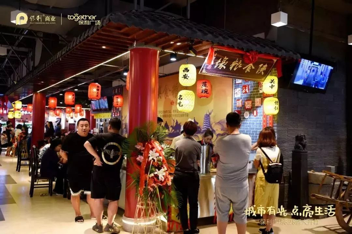 将传统元素以“潮”式呈现:巷里食光主题街区以Tiffany蓝为主色调的装潢,结合老西关的骑楼、牌坊、窗花等元素,汇集巷子钵仔糕、西关美食、龟正盅、芝麻糊世家、萝卜特牛杂等多个曾经隐匿在广州街头巷尾的地道美食品牌,传达岭南文化。