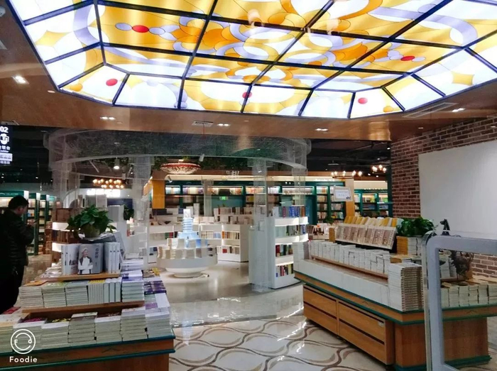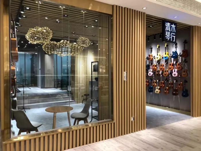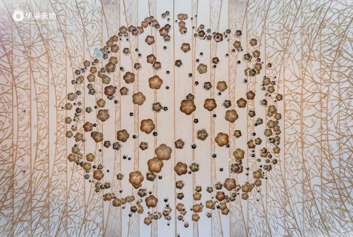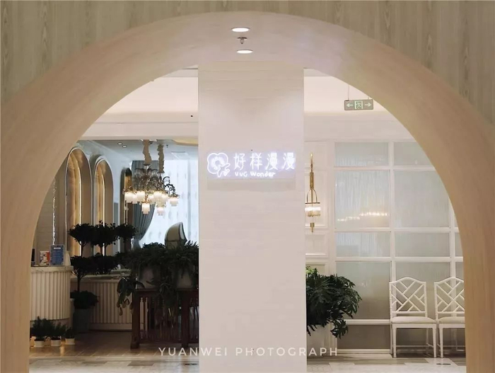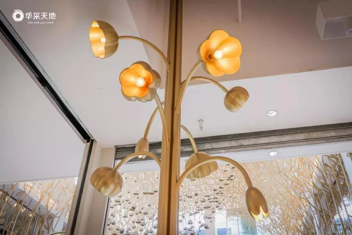 橡木色和黄铜色的画风,打造艺术殿堂:从扶梯上四楼,抬头就可以看到390朵大、中、小梅花构成的吊灯;顶部29片花格每片花纹各不相同,花格上的叶子含有VVG的图案,顶部圆球则是种子,象征着未来的美好;梅花立灯、梅花吊灯、入口处3张梅花桌结合南京元素,展现市花可爱的一面。巧克力砖和镜面的活泼跳跃感,使整个空间犹如仙境一般。
