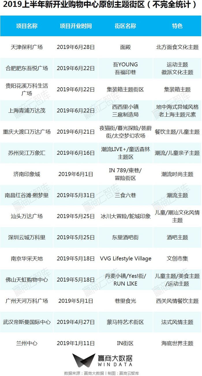 统计时间及标准:在2019年1月1日至6月30日开业,商业面积3万㎡及以上的购物中心,为不完全统计,仅供参考。