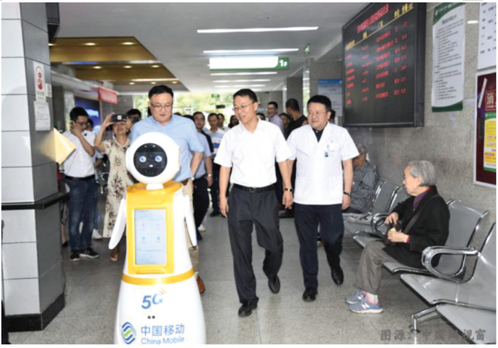 案例:在我国华西二院锦江院区,医院的门诊大厅已有5G智能导诊机器人。该5G智能导诊机器人可以实现在5G网络环境下,智能机器人能为患者提供互动式的导航导诊服务,AI智能医疗问答服务,院内科室专家介绍等情况。