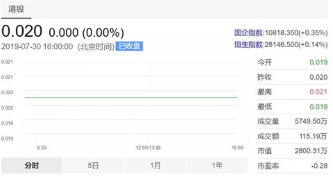 据五龙电动车财报显示,2018财年其亏损已达30.07亿港元。截至目前,其股价也是跌至0.02港币,市值低至2800.31万。