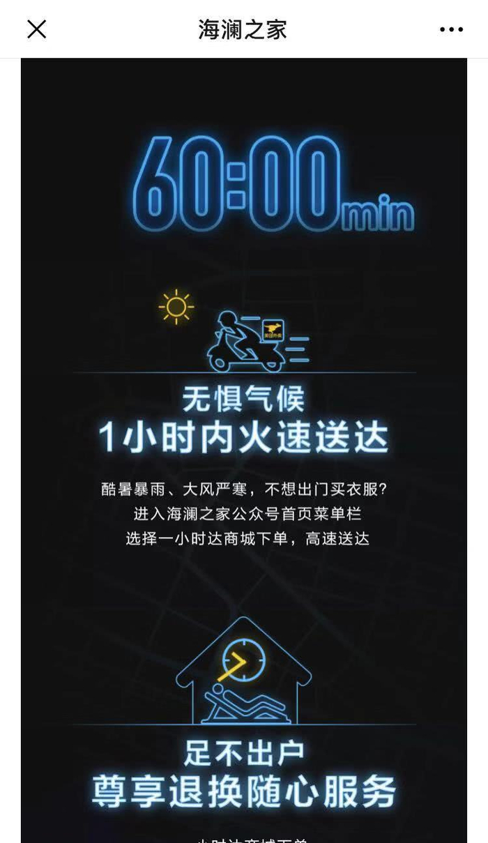 7月30日,海澜之家在微信公众号宣布推出一小时达商城。用户可通过“HLA极速达”小程序选购商品,该商城会匹配距离用户3公里以内的门店,由美团外卖骑手在一小时内送达商品,运费10元。这项服务覆盖全国300余座城市的4000多家门店,品类齐全。通过这一渠道购买的商品亦可退换,与线下消费场景打通。