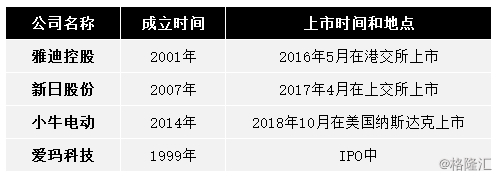 1、第一个上市的两轮电动车企业:中国两轮电动车品牌有三家已经上市的企业,分别是雅迪、新日和小牛,还有一家爱玛科技正在申请A股IPO中(如下图)。
