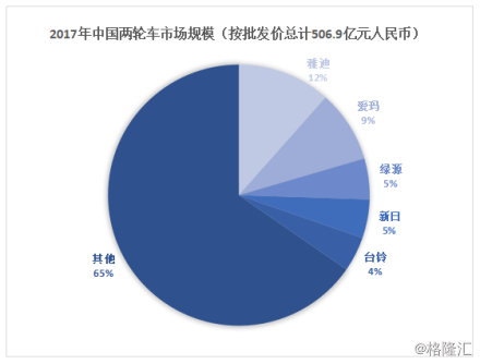 在2017年中国两轮车销售总量和金额中,行业前五家企业包揽了分别为33.89%和34.64%的市场份额;规模达到3500万辆,销售金额达到人民币506.9亿;这意味着行业的竞争集中度相当的高。