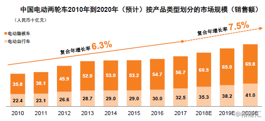 据统计,2018年中国电动自行车的总产量达到3300万辆,超过480家电动自行车企业,产品种类丰富,产业规模位居世界第一。并且根据市场预测,中国电动两轮车从2017年-2020年,还将以高于全球达7.5%的复合增长率维持销售额增长,这说明行业未来前景仍然具有较高的增长空间。(如下图)