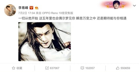 7月2日,李易峰在微博怀念百里屠苏:一切从他开始,五年里也会偶尔梦见你,瞬息万变之中,还是期待能与你相遇。