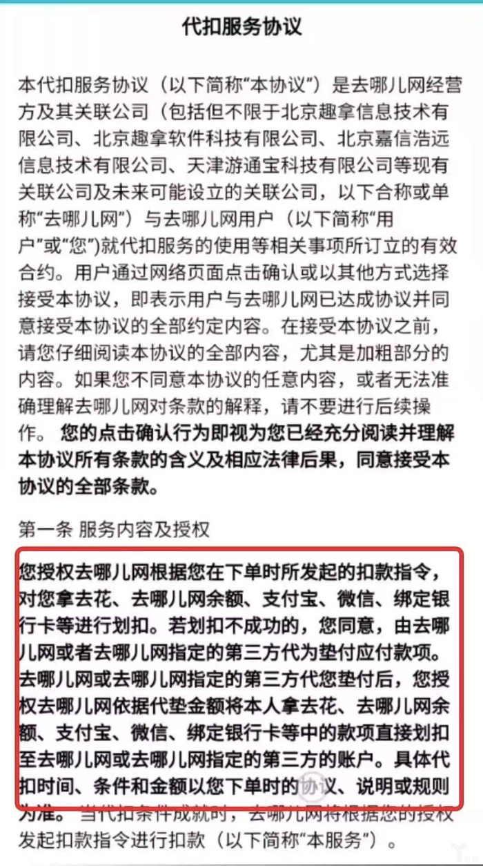 并且,闪住服务协议显示,在使用本服务期间,用户没有指定扣款方式时,去哪儿网可自由选择扣款渠道,包括上述渠道但不限于去哪儿网已开通或者未来将开通的一切扣款渠道。
