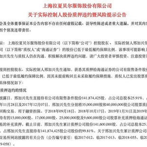 今日晚间,拉夏贝尔公告称,控股股东、实际控制人邢加兴质押给海通证券的1.416亿股A股股份已低于最低履约保障比例,因未提前购回且未采取履约保障措施,已构成违约。