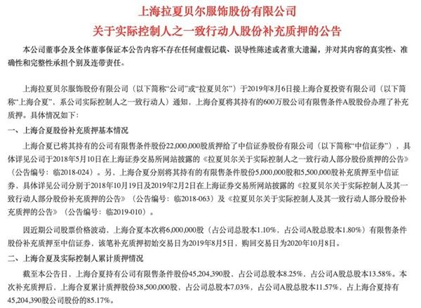 拉夏贝尔同日发布的另一则公告显示,因近期股价波动,公司实际控制人之一致行动人上海合夏投资有限公司8月6日将其持有的600万股A股股份办理了补充质押。此前,上海合夏已先后3次将所持公司股票质押至中信证券。