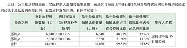 截至目前,邢加兴累计质押公司股份1.416亿股,占公司总股本25.85%,占公司A股总股本42.54%,占其直接持有公司股份的99.81%。