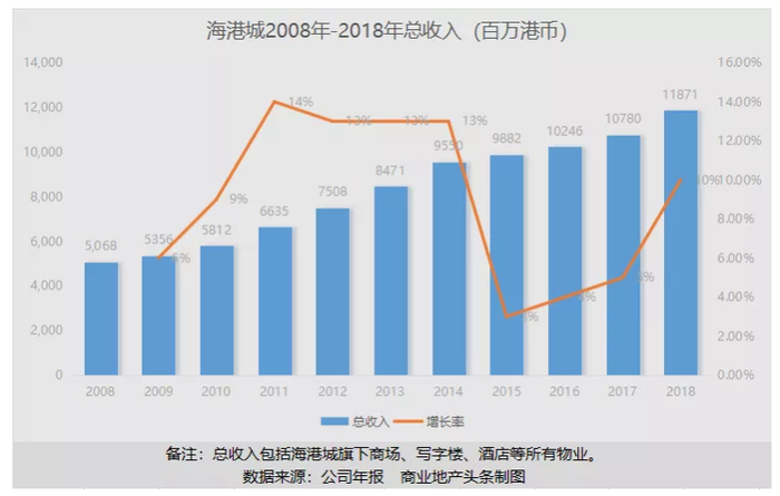 2019年4月,瑞银发表研究报告表示,预计2018至2021年间海港城租金年均复合增长仅3%至4%。