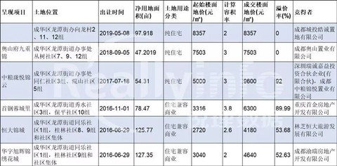 >>>2019年版块内仅成交一宗人才公寓用地,位于成华区龙潭街办向龙村2、11、12组地块,净用地面积约98亩,成交楼面价8357元/㎡,竞得者为成都城投皓诚置地有限公司。