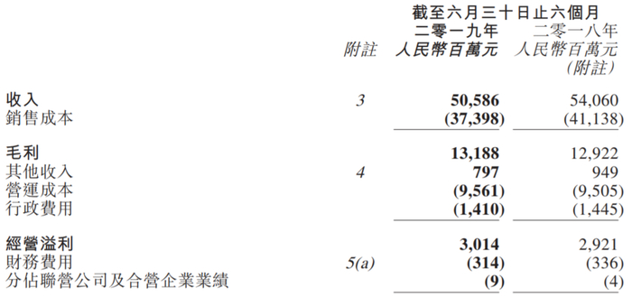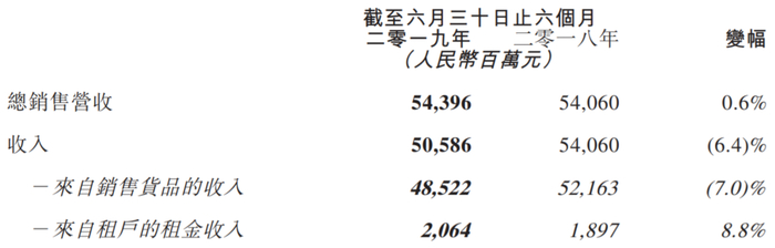 2019年上半年,高鑫零售销售货品所得收入为485.22亿元,较去年同期减少36.41亿元,减幅为7.0%。自2018年8月起,高鑫零售的家电部门便从自营转为由苏宁代销,此后,高鑫零售的家电产品销售收入为佣金收入,而非总销售营收。