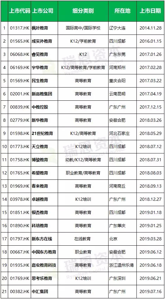 就教育企业在香港递表后的表现来看,RyanBenCapital整理汇总如下:
