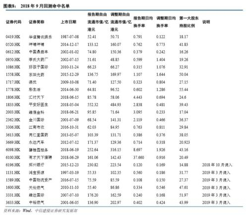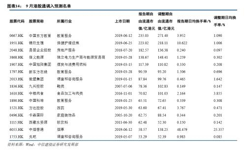 其中,10只为2019年新发行上市的股票,包括中国东方教育(0667.HK)、锦欣生殖(1951.HK)、信义能源(3868.HK)、中国旭阳集团(1907.HK)、新东方在线(1797.HK)、微盟集团(2013.HK)、中国科培(1890.HK)、方达控股(1521.HK)、中烟香港(6055.HK)、兑吧(1753.HK);1只为2019年以前上市但从未纳入港股通的新标的,包括卡森国际(0496.HK)、;另有4只为重新调入的标的,易居企业控股(2048.HK)与中粮肉食(1610.HK)于2019年3月被调出港股通,九兴控股(1836.HK)、西藏水资源(1115.HK)分别于2018年3月与9月被调出港股通,鉴于它们的运营表现有所回升,也有望于今年9月重新纳入。