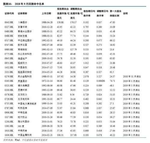 2018年9月港股通常规半年调整共调入28只标的,其中合和实业(0054.HK)已退市,有效标的共27只;我们回测位于调入范围内的标的共25只,其中17只直接命中,6只在此次常规半年调整后陆续调入,命中率为92.0%。