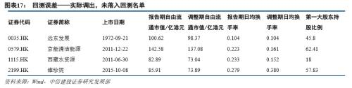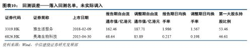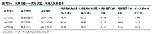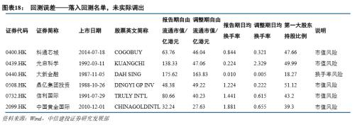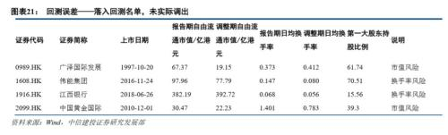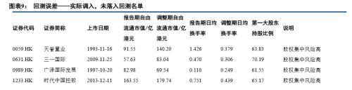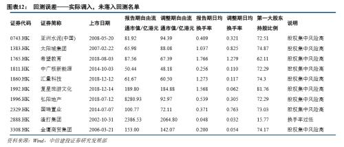 在本次调整中,有10只实际调入的标的未落在我们的回测名单中。探究原因,其中天誉置业(0056.HK)、三一国际(0631.HK)等9只标的股权集中风险较高,针对这一部分的预测误差我们会在实际预测中通过给出可能调入的股权集中公司名单进行规避;江西银行(1916.HK)虽然报告期内数据符合要求,但在调整期内换手率大幅下挫,流通性风险较高,为求稳健未列入回测名单。