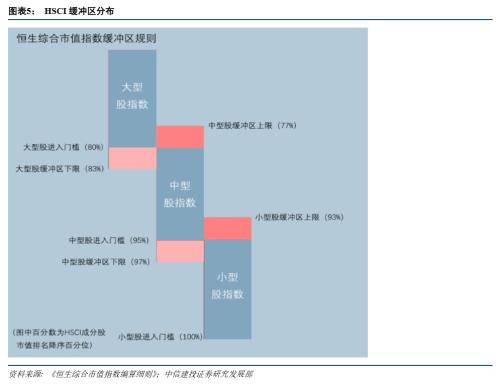 恒生综指对于市值要求设置缓冲区调整制度,累积流通市值排在选股范畴后4%的成分股将被调出,前94%的非成分股将被调入(需通过流通性测试,满足股权集中度要求)。