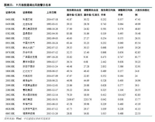另有科通芯城(0400.HK)、光启科学(0439.HK)、鼎亿集团投资(0508.HK)、信利国际(0732.HK)、中国黄金国际(2099.HK)等5只标的市值未达标,大新金融(0440.HK)换手率未达标,均具有较高的调出风险,但并未实际调出。