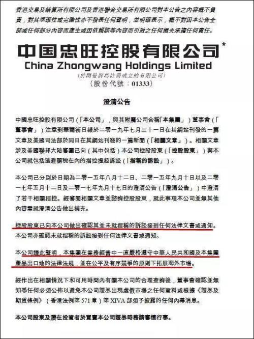 本次,中国忠旺也发布澄清公告表示,公司并未就指称的诉讼接到任何法律文书或通知。公告还强调,“集团在业务经营中一直严格遵守中华人民共和国及本集团产品出口地的法律法规,并在公平及有序竞争的原则下拓展海外市场”。