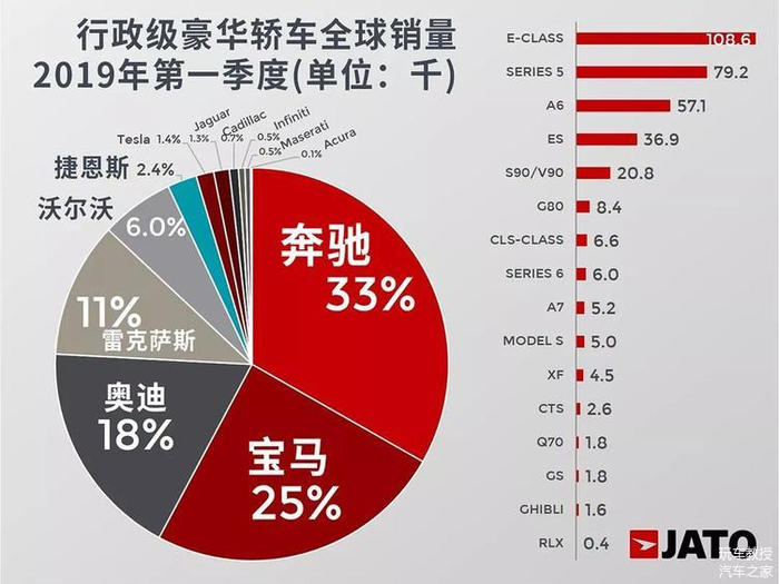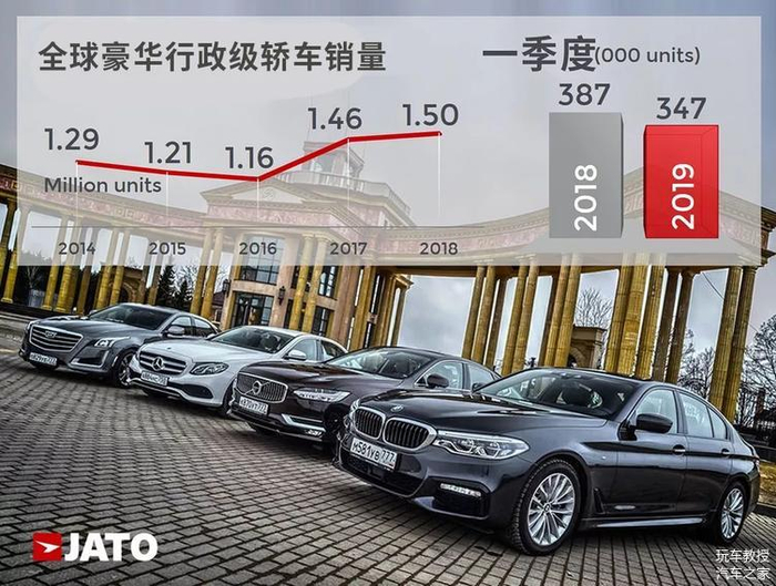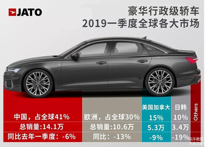 JATO调查研究显示,今年第一季度(二季度没出),全球对于高级行政用车的需求下降了10%,1-3月期间,C级车,即中大型豪华轿车,全球销量为34.6万辆,欧洲市场跌幅13%、美国市场跌幅9%、日韩市场跌19%。