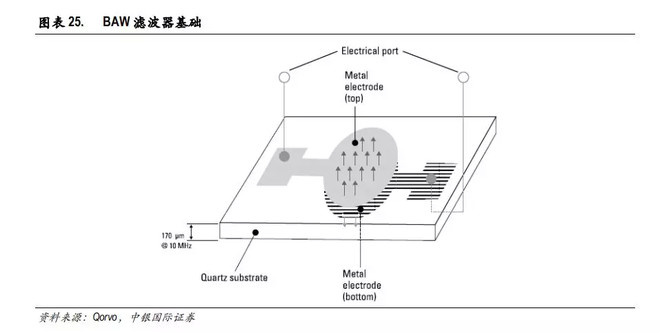 BAW滤波器也叫做体声波滤波器,不同于SAW滤波器,BAW滤波器的声波传播方向是垂直的。BAW谐振器通过石英晶体作为衬底,在上层和下层覆盖金属贴片来激发声波,从顶部表面反弹到底部表面形成驻波声波。BAW滤波器具有低插入损耗,因此有助于弥补与单个智能手机中支持多频段带来的高损耗。